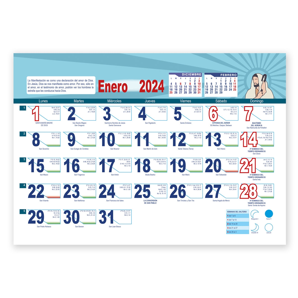 Calendario de pared apaisado. Mínimo 100 unidades. Personalización incluida en el precio con los datos que desee: imagen propia, nombre de la Parroquia, teléfono, horarios de misa, celebraciones especiales, etc. Calendario mensual especial: Leccio continua, comentarios a las lecturas de los domingos, colores de los tiempos y fiestas del año litúrgico, semanas del salterio y calendario lunar.