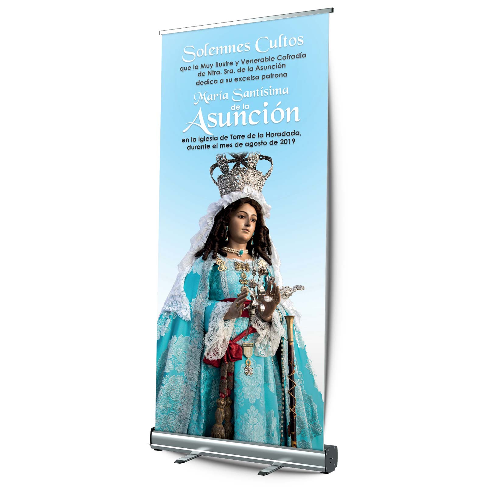 Display enrollable de 100×200 cm. con soporte de aluminio en color plata, gráfica poliéster de alta resistencia, incluye bolsa para su transporte. Idóneo para, de la forma más práctica y económica, hacer una comunicación en la parroquia más fácil, clara, cuidada y llamativa del trabajo pastoral, campañas, fiestas parroquiales, etc.