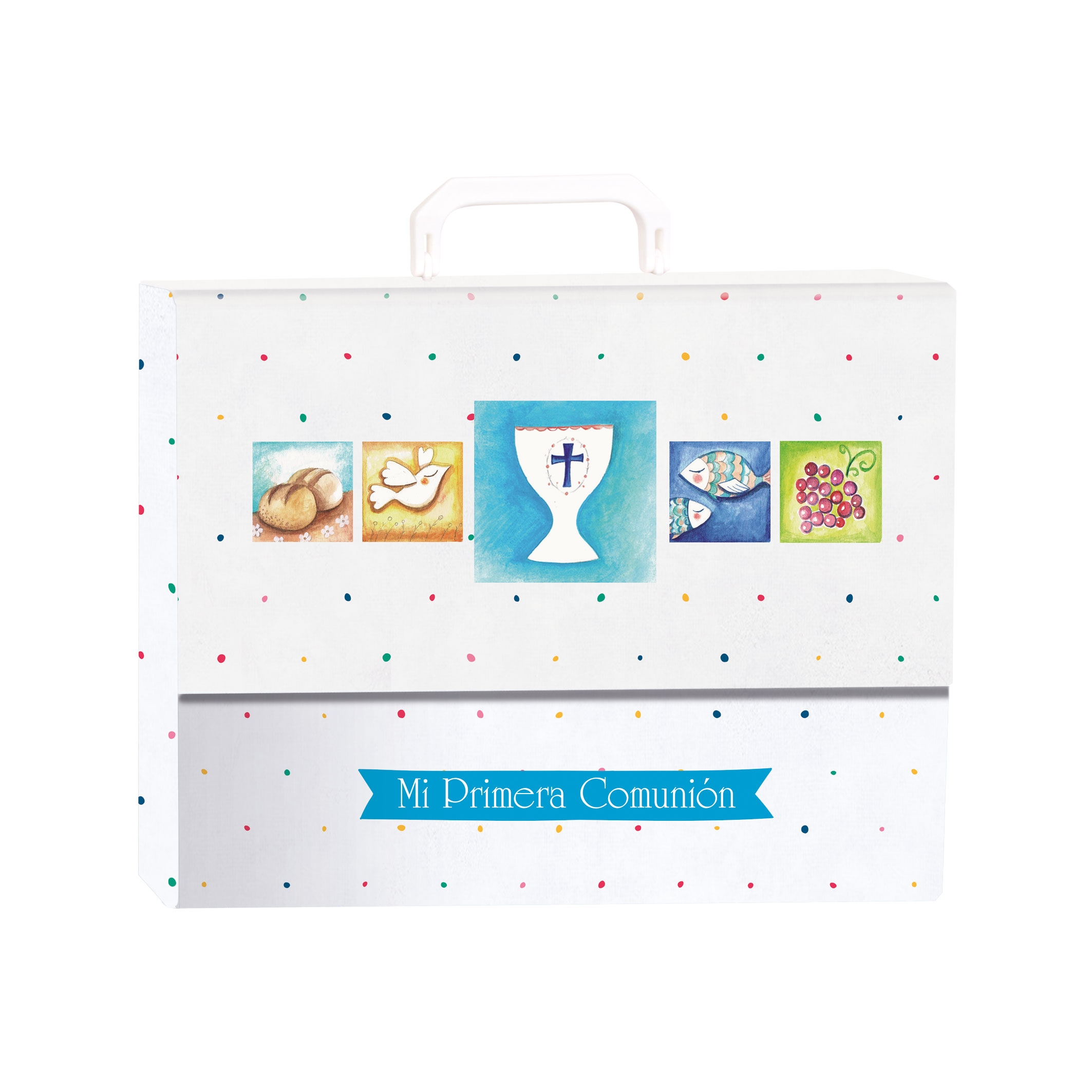 Libro de Firmas y recuerdos de Mi Primera Comunión CON MALETÍN. Dispone de 60 páginas a todo color con hojas para firmas, fotos, recordatorios, invitados, regalos… y un acabado de primera calidad. Incluye 152 pegatinas surtidas, con diferentes formas y diseños.