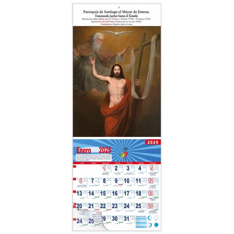 Calendario de pared de catálogo. Mínimo 100 unidades. Personalización de la cabecera incluida en el precio con los datos que desee: nombre de la Parroquia, teléfono, horarios de misa, celebraciones especiales, etc. Calendario mensual especial: Leccio continua, comentarios a las lecturas de los domingos, colores de los tiempos y fiestas del año litúrgico, semanas del salterio y calendario lunar.